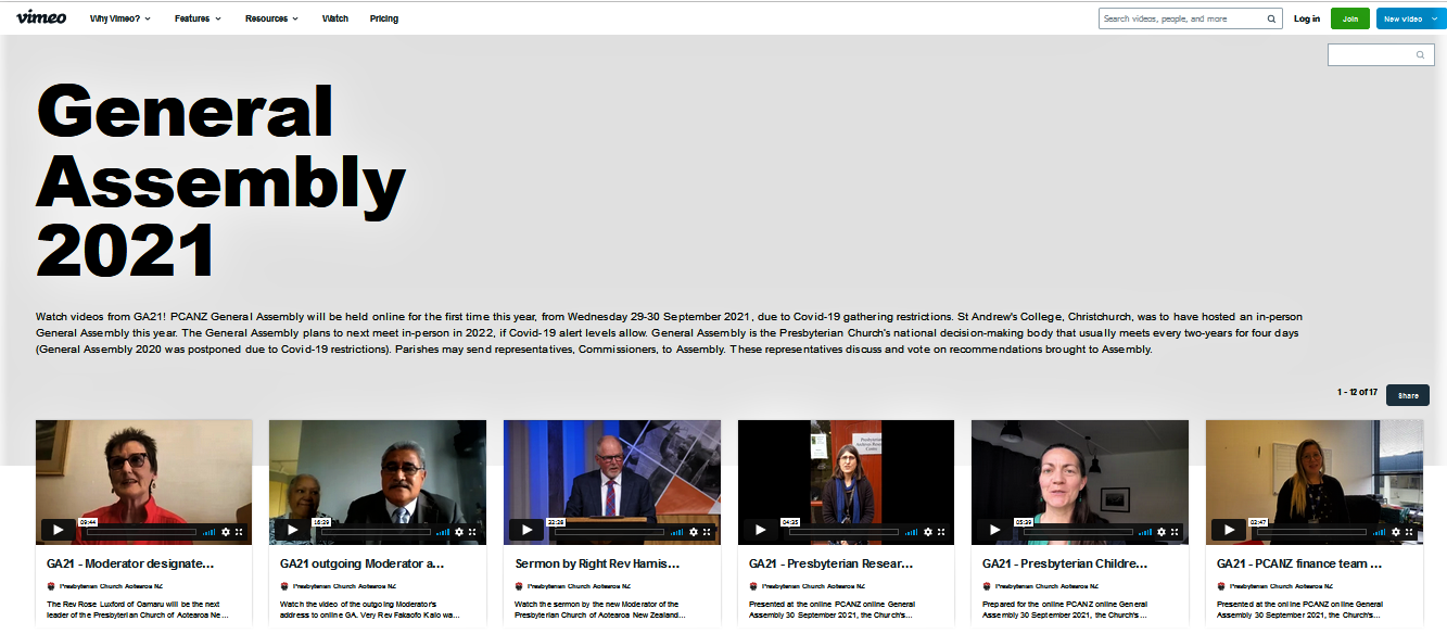 • GA21 videos on PCANZ Vimeo: sermon by Moderator; addresses by outgoing Moderator and Moderator designate; keynote speaker; overseas guests; ministries and staff.
