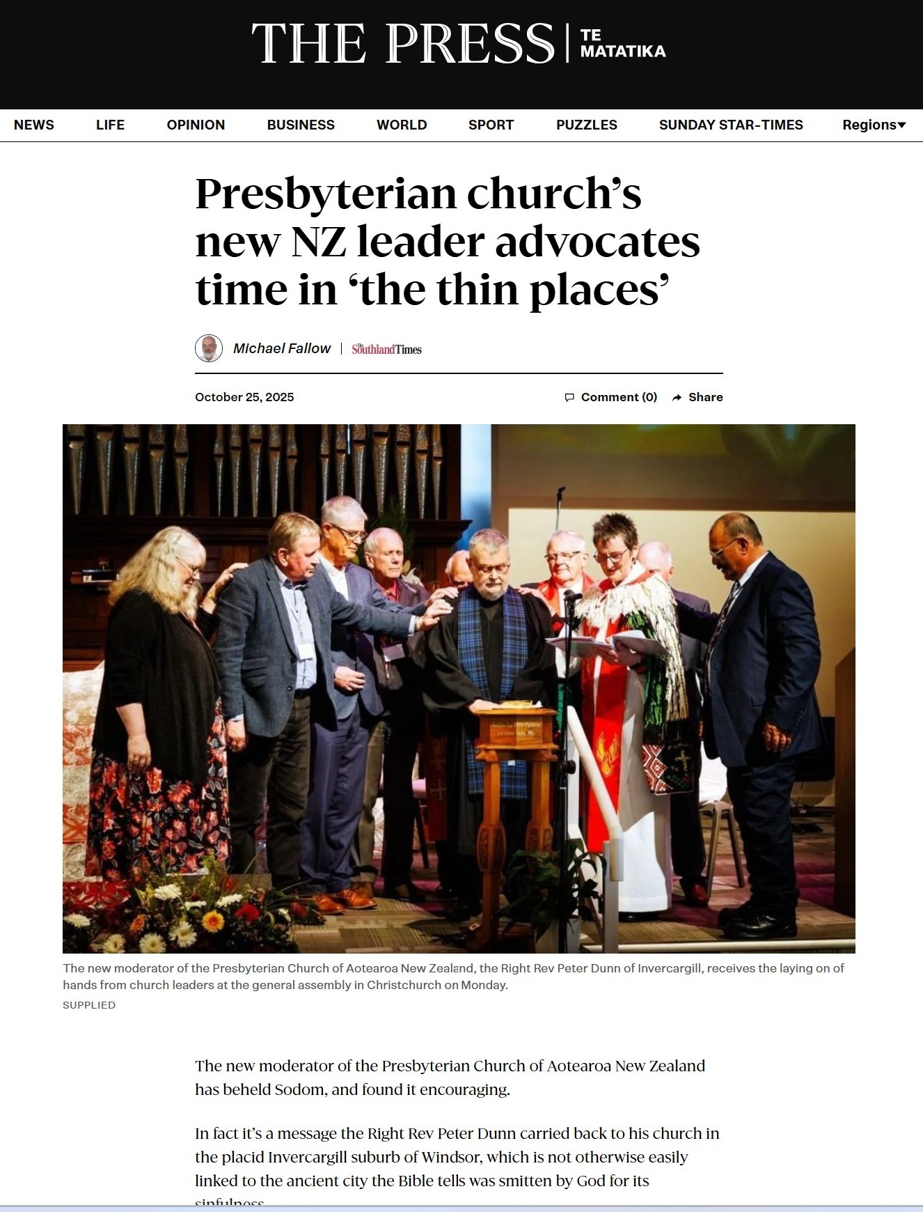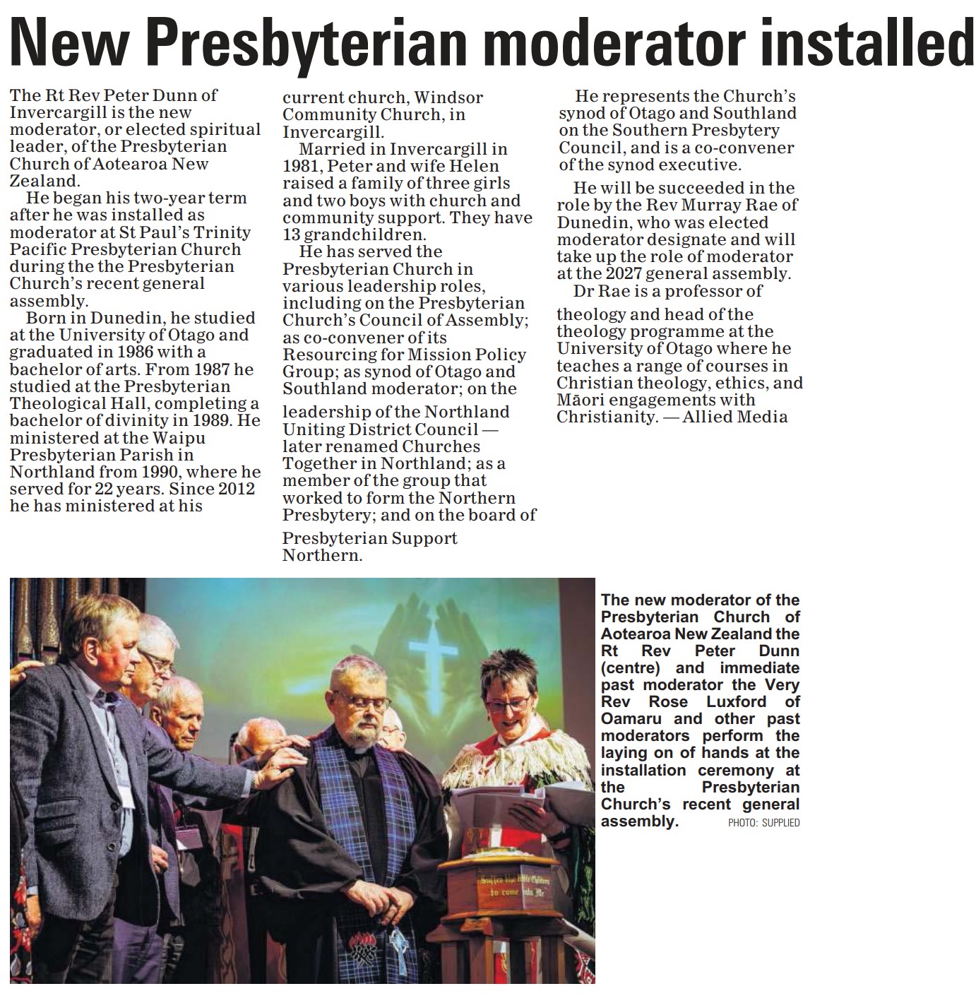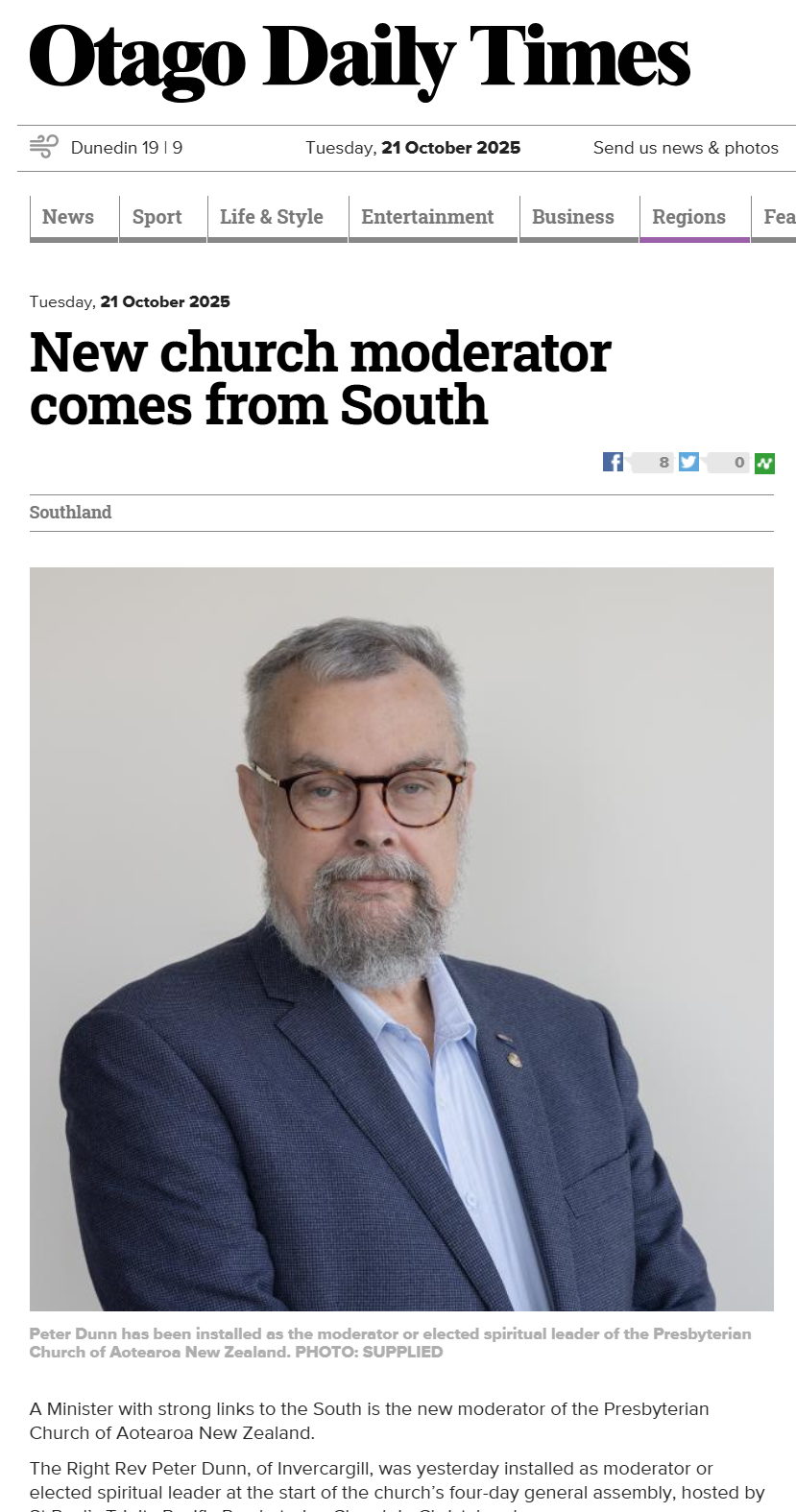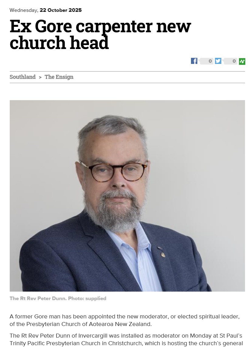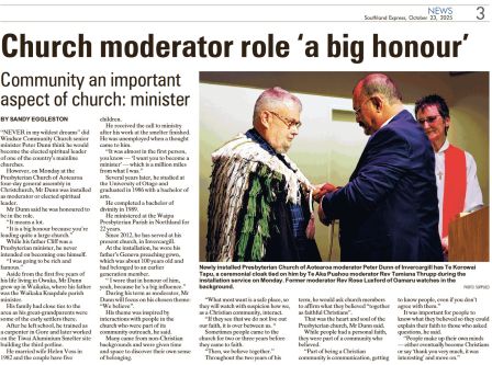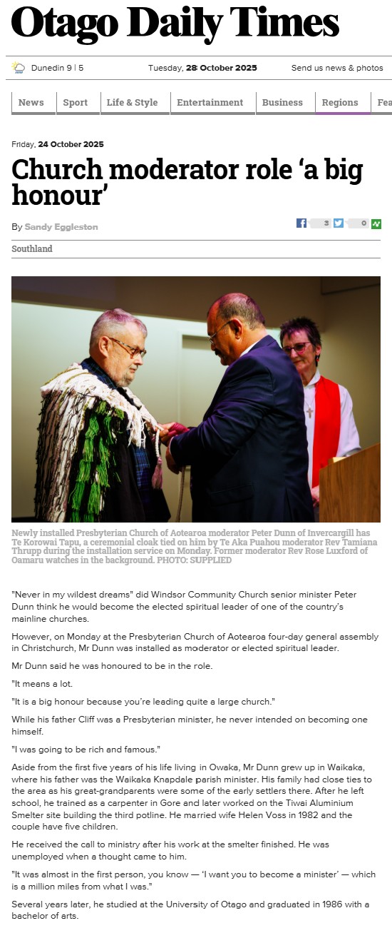 - Tuesday 21 October 2025 our new Moderator Right Rev Peter Dunn was in the Otago Daily Times - see the story here.
