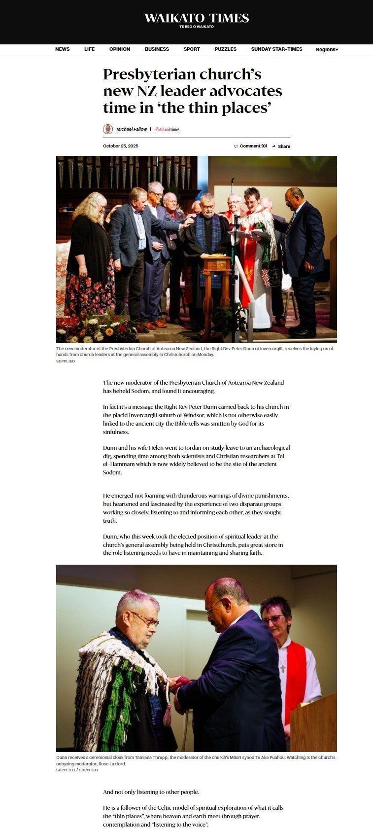 - Saturday 25 October, our new Moderator Rt Rev Peter Dunn was interviewed in The Press Christchurch, The Southland Times, and The Waikato Times, "Presbyterian church’s new NZ leader advocates time in ‘the thin places".