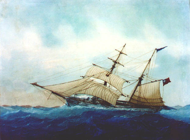 | This grainy image, taken around 1899, is believed to be a copy of the only known photograph of the "Dayspring I". This photograph belonged to Canadian Missionary Dr Joseph Annand, Principal of the Tangoa Training Institute for training native Teachers in the New Hebrides. We know that a watercolour or painting of the "Dayspring I" was also in his possession at this time. | |