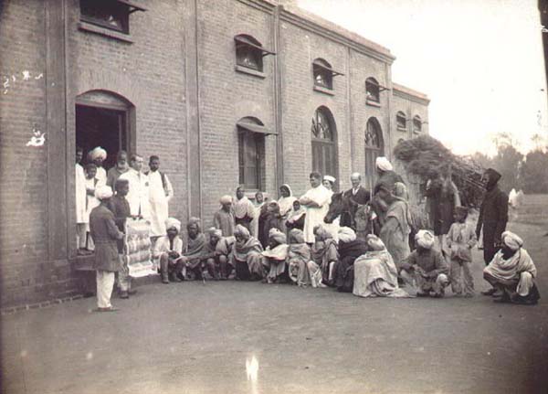 Porteous speaking to out-patients of Jagadhri Hospital while an assistant