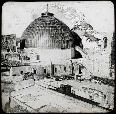 The 'Edicule' in the Church of the Holy Sepulchre An old tinted lantern slide picture of the 'edicule' within the Church of the Holy Sepulchre, Jerusalem. Surrounded by a colonnaded atrium and covered with a dome, the 'edicule' contains the remains of the cave within the Rock of Calvary that Helena and Macarius had identified as the burial site of Jesus prior to the resurrection. The surrounding rock was later cut away, and the former tomb encased in the 'edicule' which remains inside the church to this day. "Now after the sabbath, toward the dawn of the first day of the week, Mary Magadalene and the other Mary went to see the sepulchre. And behold, there was a great earthquake; for an angel of the Lord descended from heaven and came and rolled back the stone, and sat upon it. His appearance was like lightening, and his raiment white as snow. And for fear of him the guards trembled and became like dead men. But the angel said to the women, "Do not be afraid; for I know that you seek Jesus who was crucified. He is not here; for he has risen, as he said." [Matthew 28:1-6] |