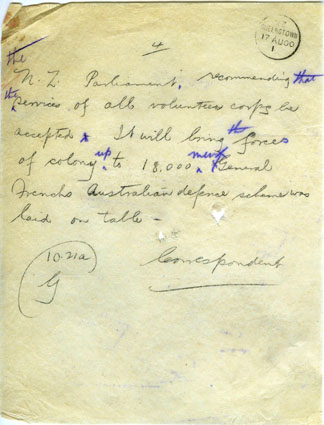 The text also reads that "The Defence Committee have submitted report to N.Z. Parliament, recommending [that] services of all volunteer corps be accepted. It will bring [the] forces of colony [up] to 18,000 [men]."