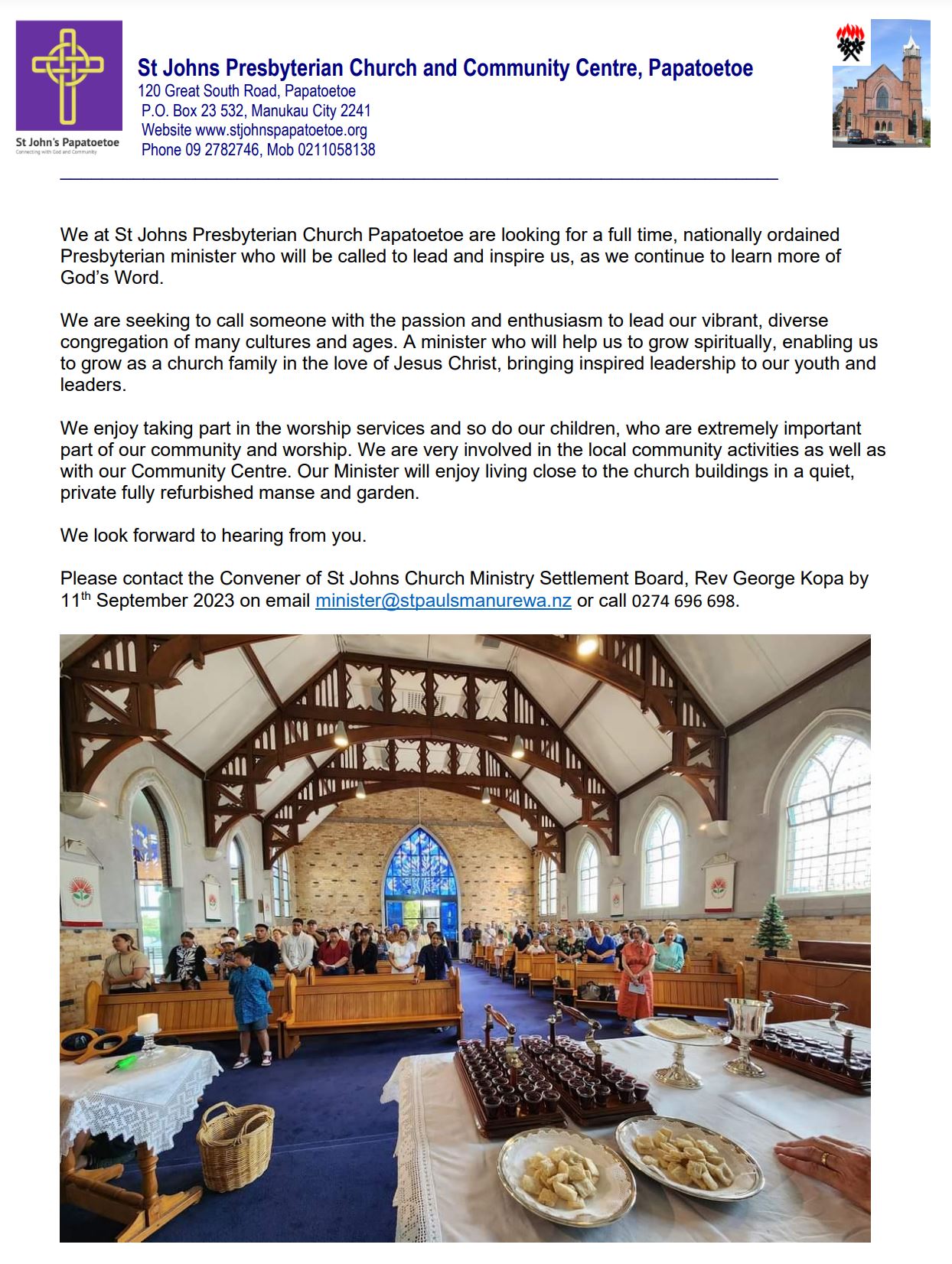 Applications open until September 30th 2025. A comprehensive parish profile is available on request, please contact Rev Dr Christine Sorensen email or phone 021 117 786.