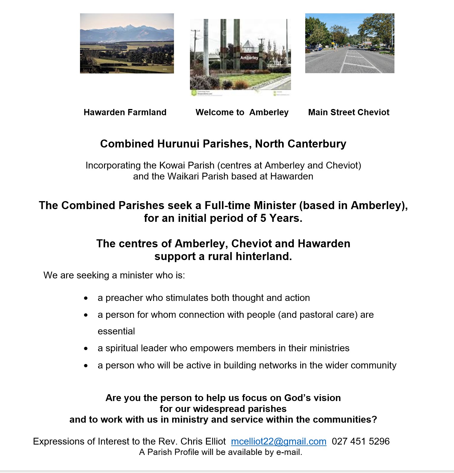To learn more or request a parish profile contact Rev Howard Carter, email or phone 027 750 8602