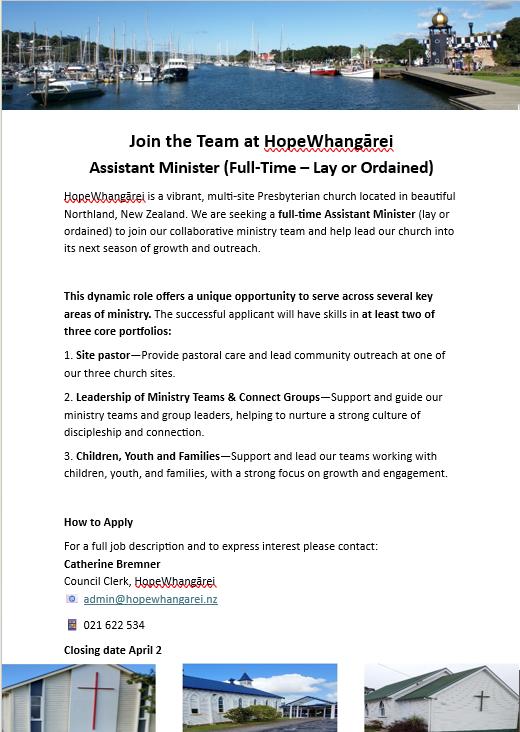 • For a full job description and to express interest please contact: Catherine Bremner, Council Clerk, HopeWhangārei.