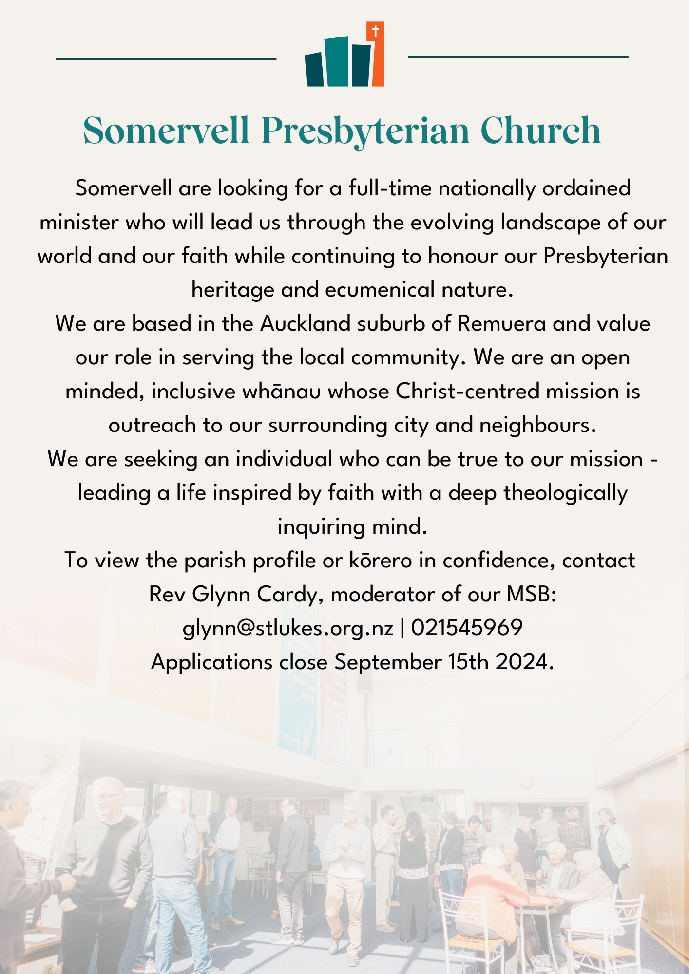 | Wakatipu Community Presbyterian Church | F/T | Rev Ian Hyslop | Senior Minister - Team Ministry | 05/25 | ||