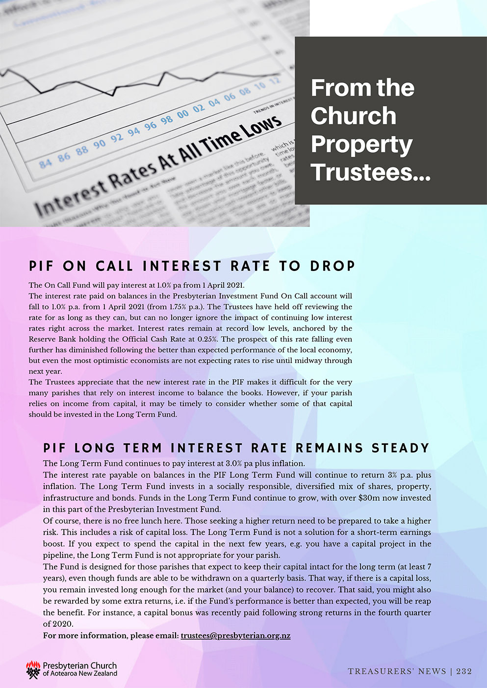 Deposits and withdrawals can be processed as normal during current alert levels, observing the requirement to provide advance notice for major (>$100,000) withdrawals. The interest rate paid on the PIF On-Call Fund is 1.0% pa (from 1 April 2021). The interest rate on the PIF Long-Term Fund remains at 3.0% pa plus inflation. Rates are subject to change. The PIF is open to parishes, but not to individuals. For details on the Long Term Fund or further information, email the Trustees’ Executive Officer, Russell Garrett.