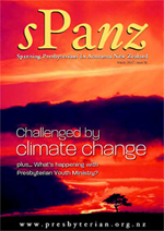 Spanz March 2007In the March issue, we look at climate change, the impact we are having on God’s creation, and how we can respond individuals and congregations.  Amanda Wells reports on what’s going on with the Presbyterian Youth Ministry, and we explore ground-breaking research by a Dunedin minister that will show how culture and ethnicity affect congregations with in the Presbyterian Church of Aotearoa New Zealand.  We profile the Financial Services Department in the first of a series of articles throughout 2007 that will introduce the departments that make up the nine-person team at the Presbyterian Church of Aotearoa’s New Zealand’s Wellington Assembly Office.  Gillian Vine describes the experiences of the Jensen family, which include running a major mining company in Zimbabwe to managing Camp Columba in eastern Southland, and we report on last year’s visit by the Rev Setri Nyomi, the General Secretary of the World Alliance of Reformed Churches.  See below for links to these and more articles.