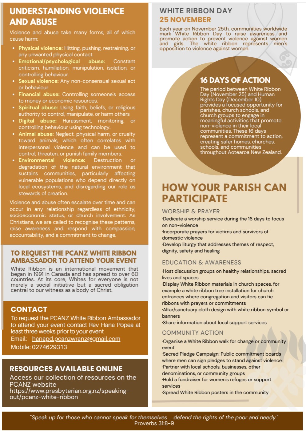 These resources allow you to tailor activities to your local context/need, and are all available on the PCANZ website White Ribbon page here (see menu on left for different year resources). These diverse resources offer flexibility in promoting White Ribbon Day and preventing abuse and violence in our communities. We encourage you to explore both current and past materials to create a campaign that resonates with your specific congregation and community